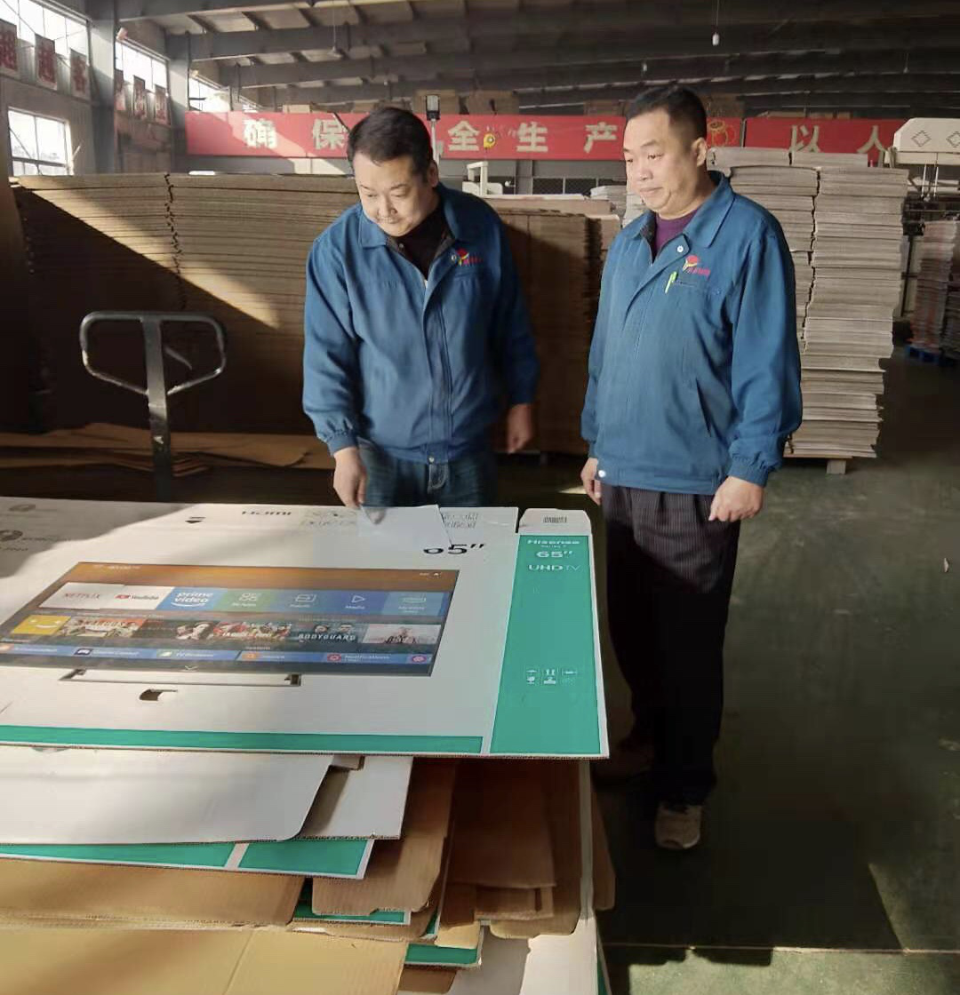 紙箱分公司總經(jīng)理衣學(xué)國、經(jīng)理陳冰正在研討產(chǎn)品結(jié)構(gòu)、確定追趕客戶產(chǎn)品交貨日期。